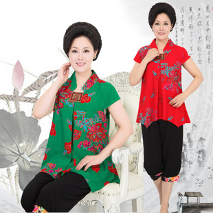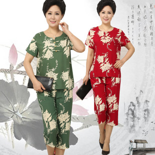 鎮店之寶夏季中老年女裝綿綢套裝女短袖t恤全棉家居服中年媽媽裝 /