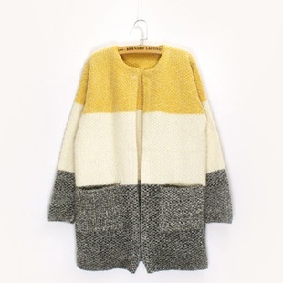MK002 秋裝中長款毛衣針織開衫女新款馬海毛長袖條紋撞色外套女裝 /