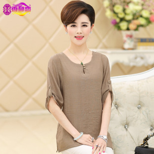 中老年女裝夏裝寬松大碼純色短袖T恤薄款透氣中年媽媽棉麻上衣女 /
