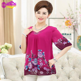中老年媽媽裝夏裝真絲短袖t恤女 中年女裝大碼印花桑蠶絲短袖上衣 /