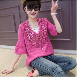 韓國東大門代購秋裝新款手工寶石鑲鉆喇叭袖套頭 女式針織衫 /