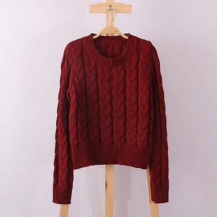 春裝女復古粗線麻花打底毛衣套頭圓領高腰短款毛衣 針織衫 /