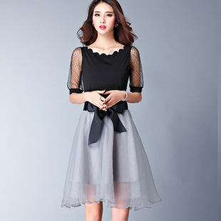 2015夏季新款韓版時尚套裙女裝修身兩件套歐根紗復古中裙廠家直銷 /