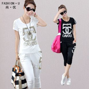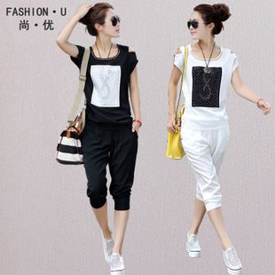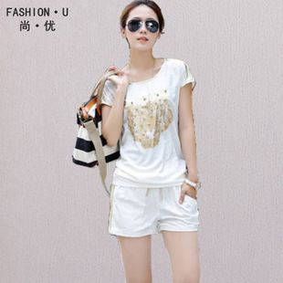 2015夏休閑套裝歐洲站新款短袖 時尚繡花釘珠女休閑套裝運動女 /