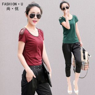 簡介: 貨號 1751133 產地 杭州 主圖來源 實拍有模特 貨源類別 現貨 是否庫存 是 風格 休閑 圖案 純色 面料 棉 款式 褲套裝 上衣款式 T恤 上衣袖長 短袖 褲款式 哈倫褲 流行元素 鉚釘 上市年份/季節 2015夏季 顏色 黑色,酒紅色,墨綠色 尺碼 M,L,XL,XXL