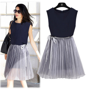 歐洲站2015夏季新款女裝雪紡連衣裙兩件套歐根紗百褶半身裙套裝潮 /