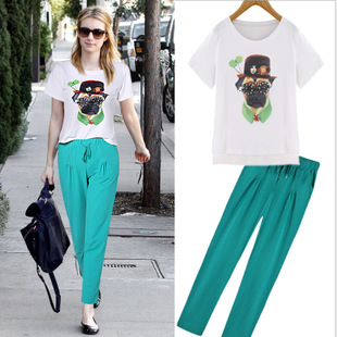 歐洲站2015夏季新款時尚印花釘珠短袖T恤+九分褲休閑兩件套套裝女 /