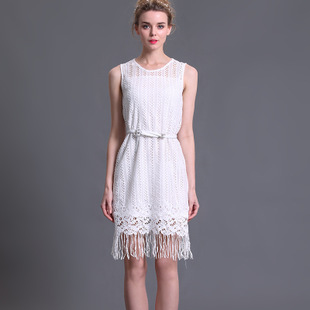 2015夏季新品勾花流蘇無袖背心裙 時尚圓領(lǐng)白色品牌連衣裙代理 /
