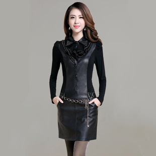 秋裝新款 韓版氣質修身大碼裙子長袖打底pu皮裙OL連衣裙 /