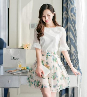 2015新款女裝韓版兩件套印花雪紡連衣裙 半裙加上衣 /