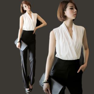 批發(fā)夏季韓版修身無袖雪紡連體褲女長褲套裝V領(lǐng)顯瘦連衣闊腿褲 /