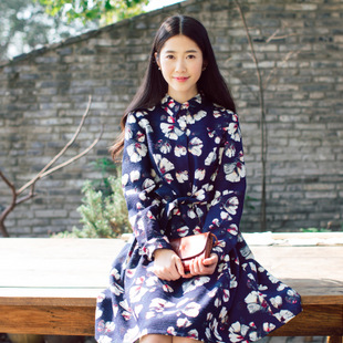 宿本春裝新款 文藝復古藍底白花印花中長裙 翻領長袖襯衫連衣裙女 /