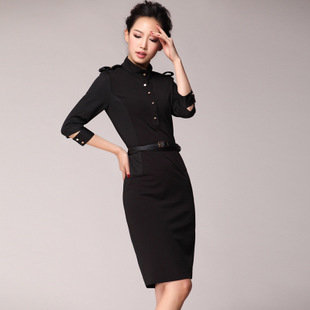2014新款 連衣裙 歐美女裝立領肩章修身連衣裙送腰帶一件代發 /