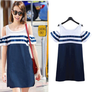 2015夏季新款歐美海軍風條紋性感露肩修身顯瘦大碼掛脖連衣裙 /