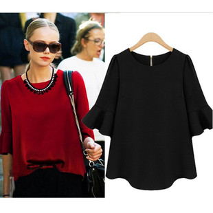 歐美純色女式大碼女裝 胖mm寬松加大五分喇叭袖雪紡時尚復古t恤 /