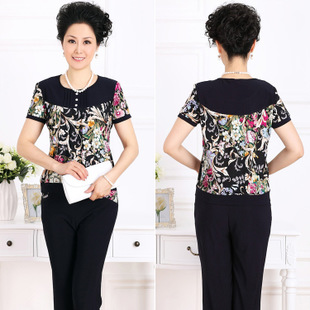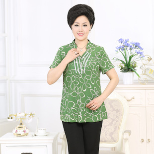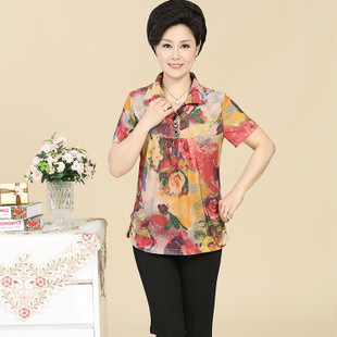 2015新款中老年女裝夏裝 短袖t恤女 翻領時尚印花媽媽T恤 批發 /