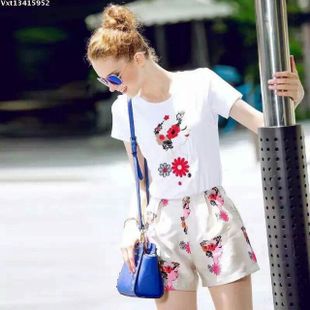 時尚大牌女裝走秀款繡花美女圖圓領短袖T恤+印花短褲套裝 /