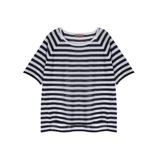 夏季圓領寬條紋短袖針織衫打底衫薄寬松顯瘦潮 工廠直銷黑白上衣 /