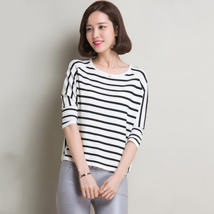 黑白條紋五分袖蝙蝠衫 打底衫女短款T恤薄 套頭針織衫女士 批發 /