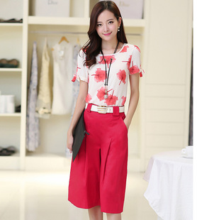 夏裝新款時尚兩件套裝女印花雪紡衫上衣顯瘦休閑闊腿褲 /