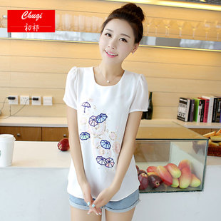 初祁 2014年春夏新款甜美雨傘印花圓領短袖雪紡衫t恤 女 /