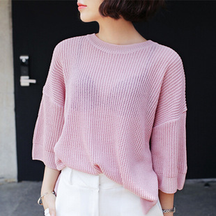 預售2015秋裝新款女裝潮韓版七分袖不規則罩衫鏤空寬松套頭針織衫 /