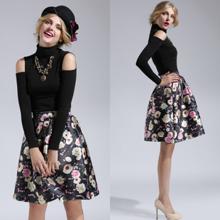 露肩高領長袖純棉T恤+蓬蓬傘裙套裝 2015春 兩件套時尚 深圳南油 /