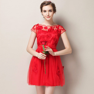 紅色連衣裙夏 新娘敬酒禮服修身歐美繡花 /
