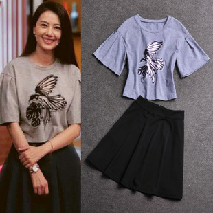 2015夏季新款女裝高圓圓明星同款喇叭袖印花上衣+半身裙休閑套裝 /