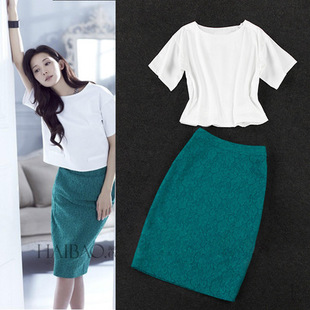 2015春夏韓國代購女裝夏新款明星同款OL連衣裙蕾絲半身裙兩件套裝 /