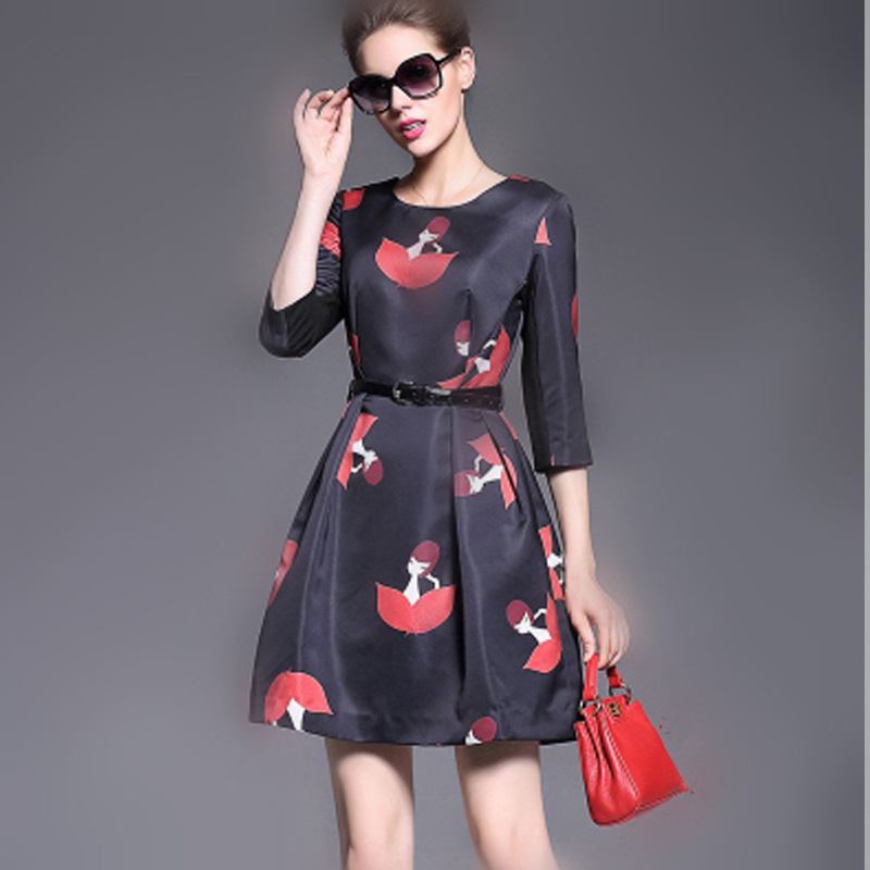 2015秋裝新款女裝卡通小香風印花連衣裙時尚修身氣質大擺裙 /