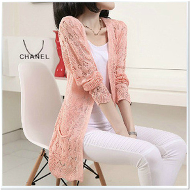 秋季新品韓版口袋修身顯瘦鏤空中長款開衫外套針織衫廠家貨源批發 /