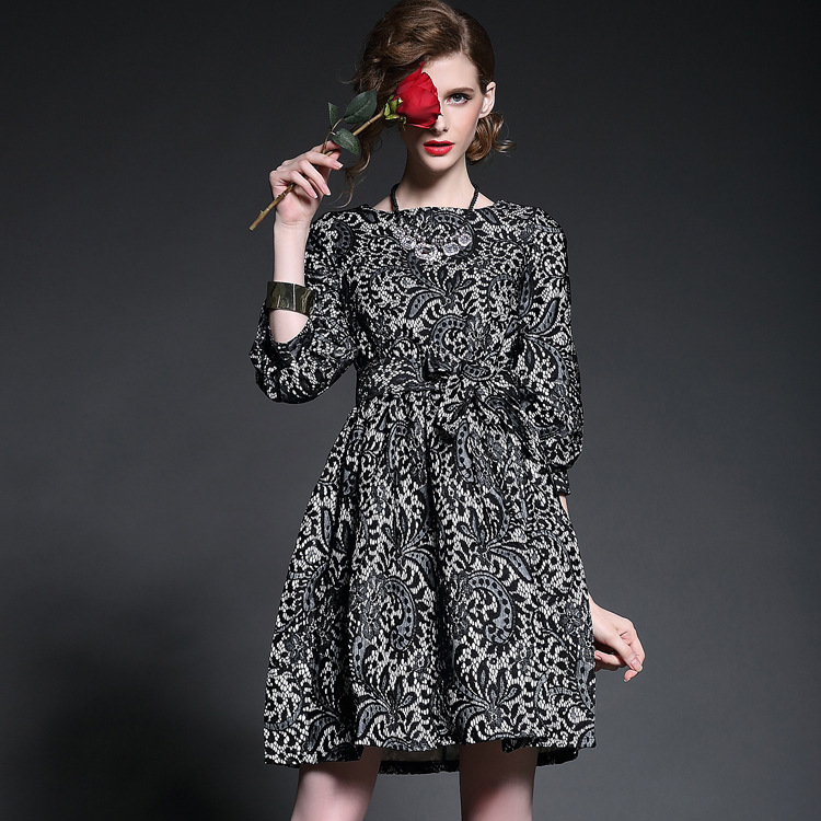 2015歐洲站秋裝女裝氣質復古圓領蕾絲收腰大擺顯瘦連衣裙女蓬蓬裙 /