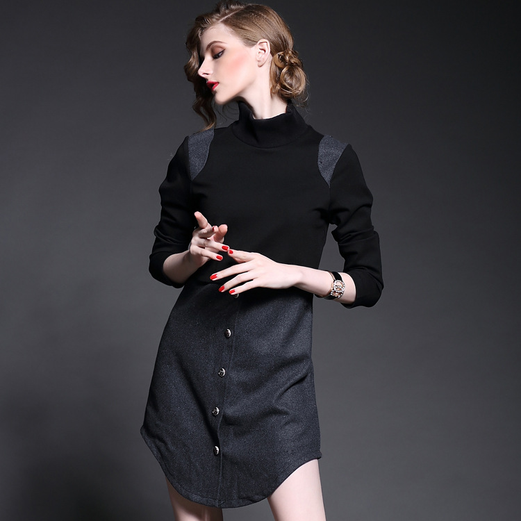 2015歐洲站女裝秋裝新款高領假兩件拼接連衣裙女顯瘦長袖打底裙 /
