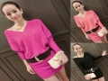 秋裝新款女裝韓版修身性感連衣裙時尚冰絲針織蝙蝠袖連衣裙配腰帶 /