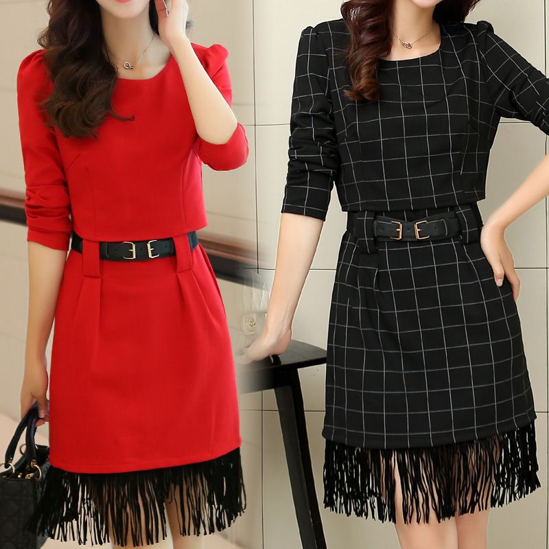 秋裝女假兩件套針織長袖連衣裙 流蘇包臀修身紅色打底短裙 /