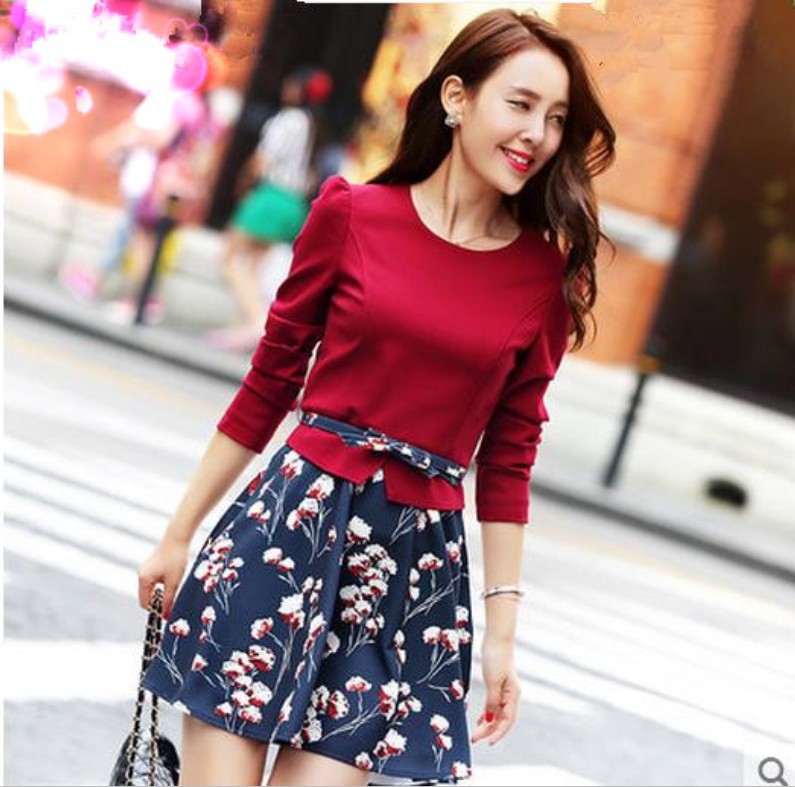 2015秋裝新款 韓版女裝拼接印花長袖假兩件套裝連衣裙 /