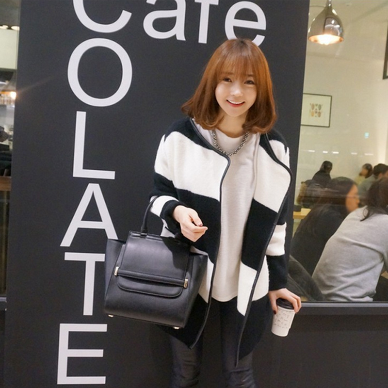 2015秋冬裝新款韓版女裝清倉撞色長袖針織衫條紋外套秋季毛衣批發(fā) /
