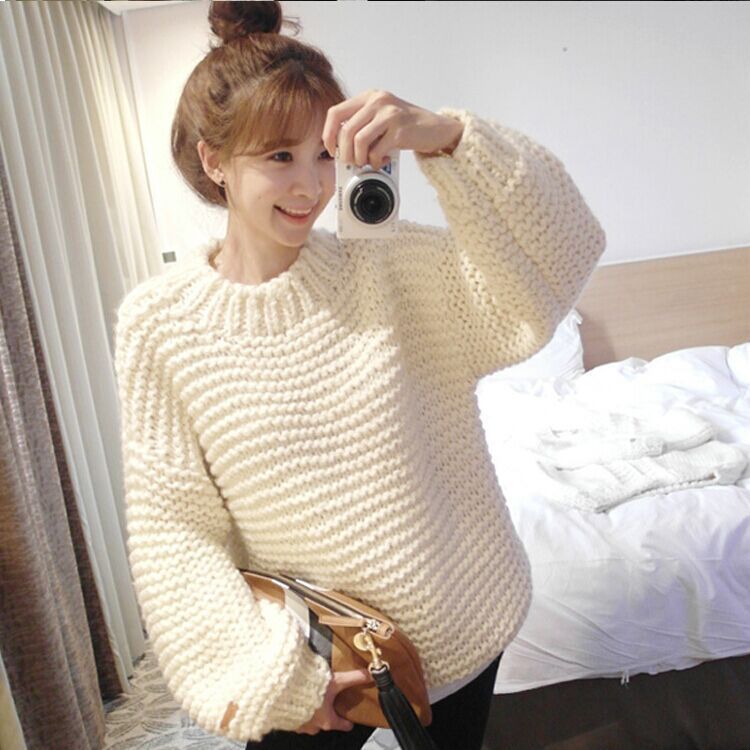 新款韓版寬松大碼泡泡袖粗棒針毛衣 /