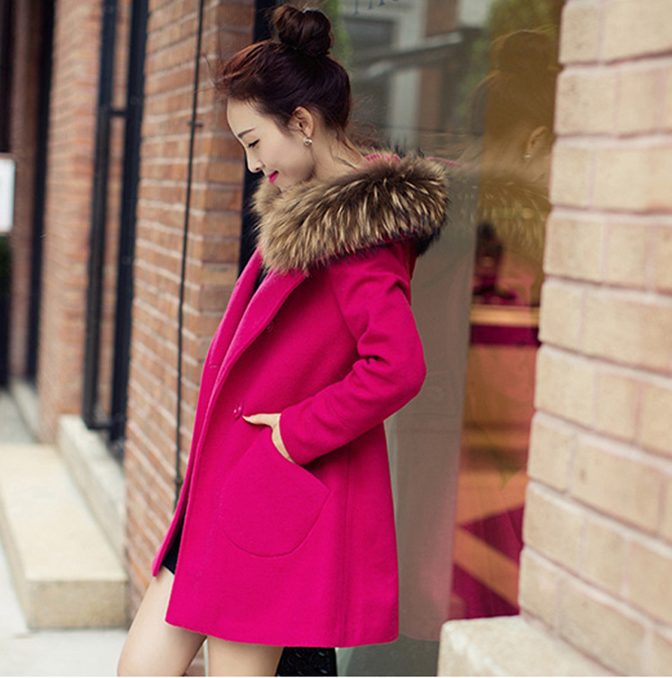 韓版純色拼接毛領雙排扣修身呢子外套中長款女裝 /