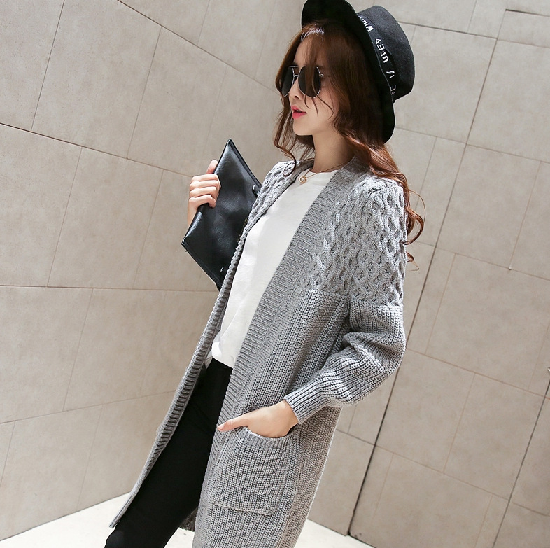 歐洲站秋學生毛衣外套女針織開衫大毛衣口袋寬松V領加厚中長款 /
