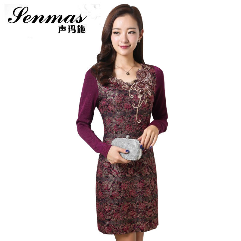 2015秋季連衣裙高端修身刺繡女裝真絲裙子歐美大碼長袖連衣裙批發(fā) /