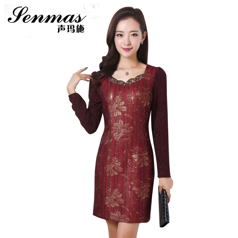 2015聲瑪施新款絲麻女裝連衣裙 長袖禮服秋季時尚兩件套紅色女裙 /