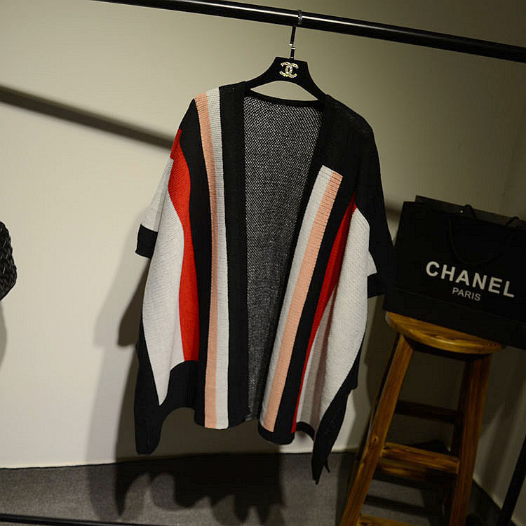 2015秋冬新款女裝韓版蝙蝠斗篷型條紋撞色寬松針織開衫外套毛衣女 /
