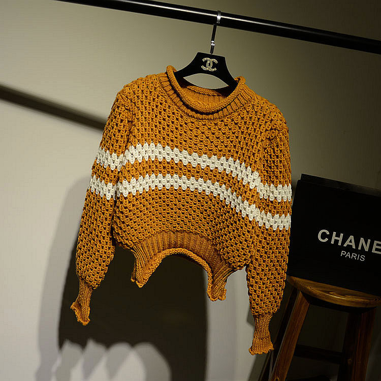 簡介: 貨號51010 產地桐鄉濮院 主圖來源實拍無模特 貨源類別現貨 是否庫存是 庫存類型整單 毛線粗細粗毛線 毛衫工藝針織 風格韓版 圖案條紋 款式套頭 組合形式單件套 版型寬松型 衣長短款(40cm<衣長≤50cm) 領型圓領 袖型常規袖 袖長長袖 厚薄加厚 流行元素撞色,卷邊 工藝高溫定型