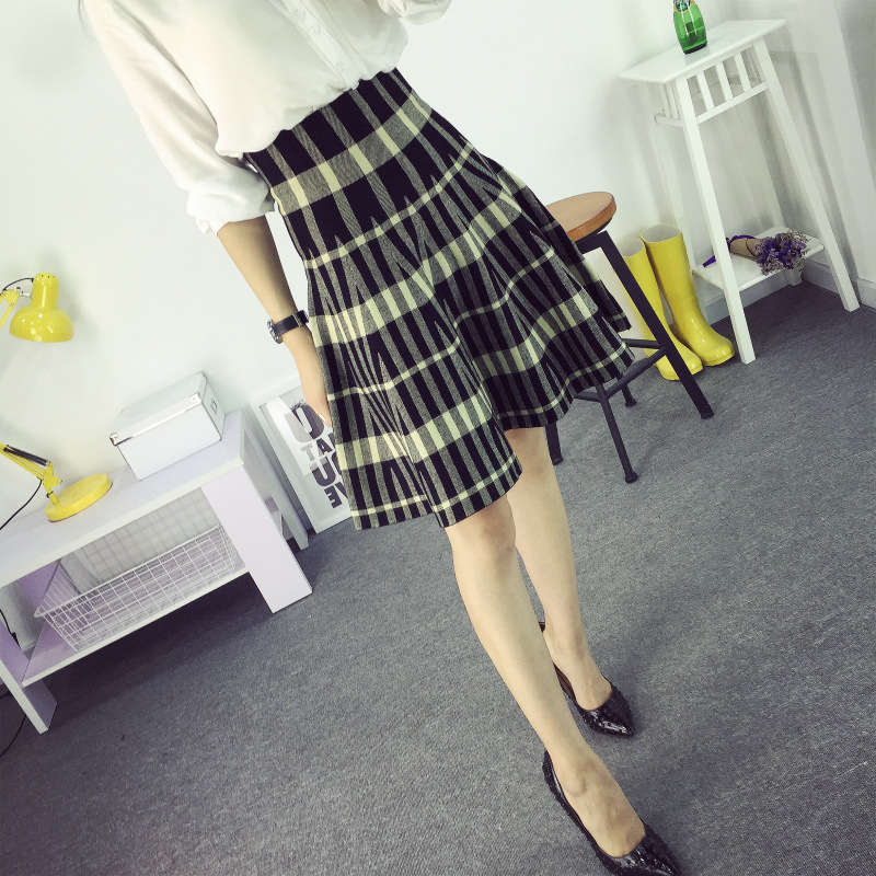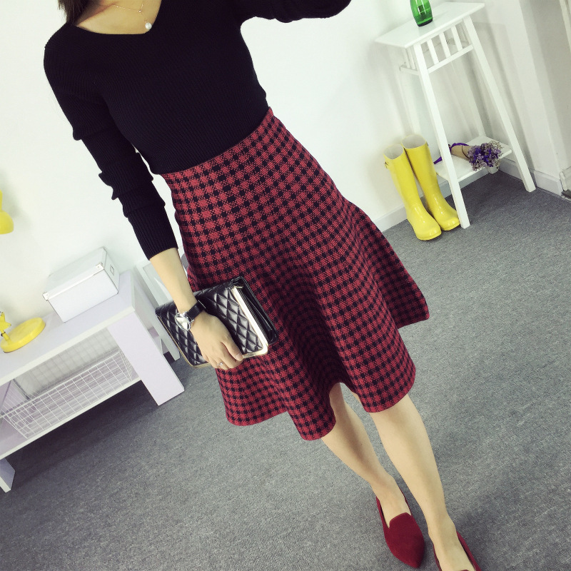2015秋季歐美百搭顯瘦針織中長款高腰半身裙格紋傘提花裙913 /