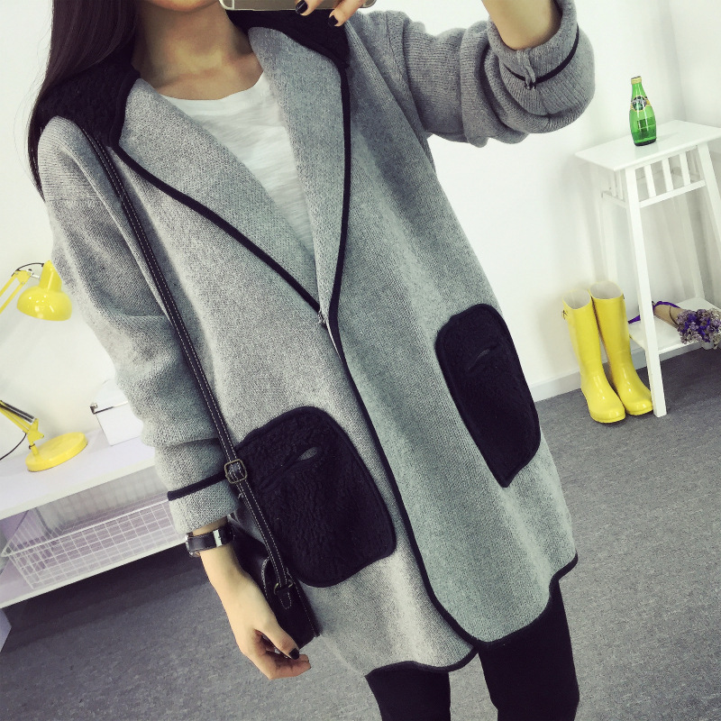 2015新款 韓國寬松拼色連帽針織開衫毛衣 女式毛衫 批發 /