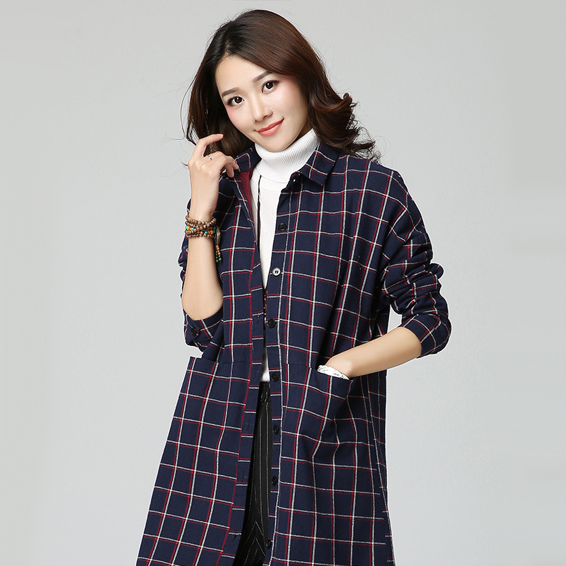 2015秋季新品女裝襯衫女士長袖中長款開衫棉質翻領格子圖案襯衫女 /