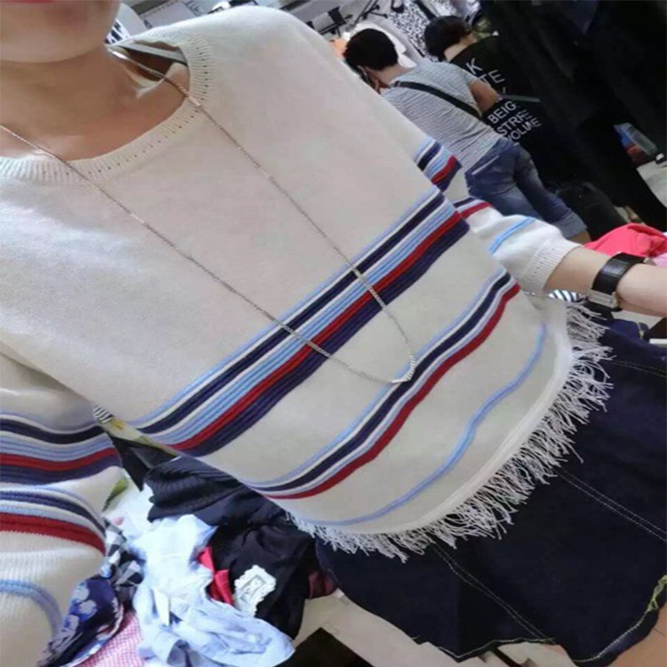 歐洲站秋季新款女裝復(fù)古寬松流蘇下擺條紋針織衫套頭毛衣女潮 /