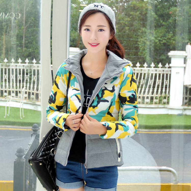 2015冬季新款女裝韓版時(shí)尚迷彩短款羽絨服拼接連帽長(zhǎng)袖外套女潮 /